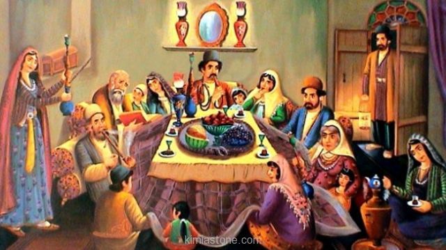 آن روزها افراد فامیل بنا بر رسمی دیرینه به خانه بزرگترین فرد فامیل که معمولا پدر بزرگ و مادر بزرگ بودند میرفتند و با تکاندن برفهای زمستان از لباس هایشان در گرمای آرامش بخش کرسی فرو میرفتند. افراد فامیل بر سر یک سفره باهم شام میخوردند و بر روی سفره مخصوص این شب خوردنیهای متنوعی چیده میشد.